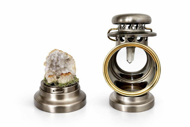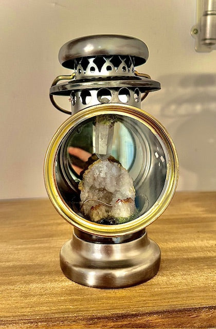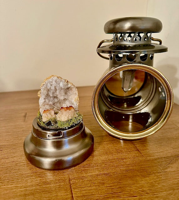 This enchanting piece transforms an antique oil lantern into a miniature crystal display, featuring radiant citrine stones, glittering geodes, and lush mosh.